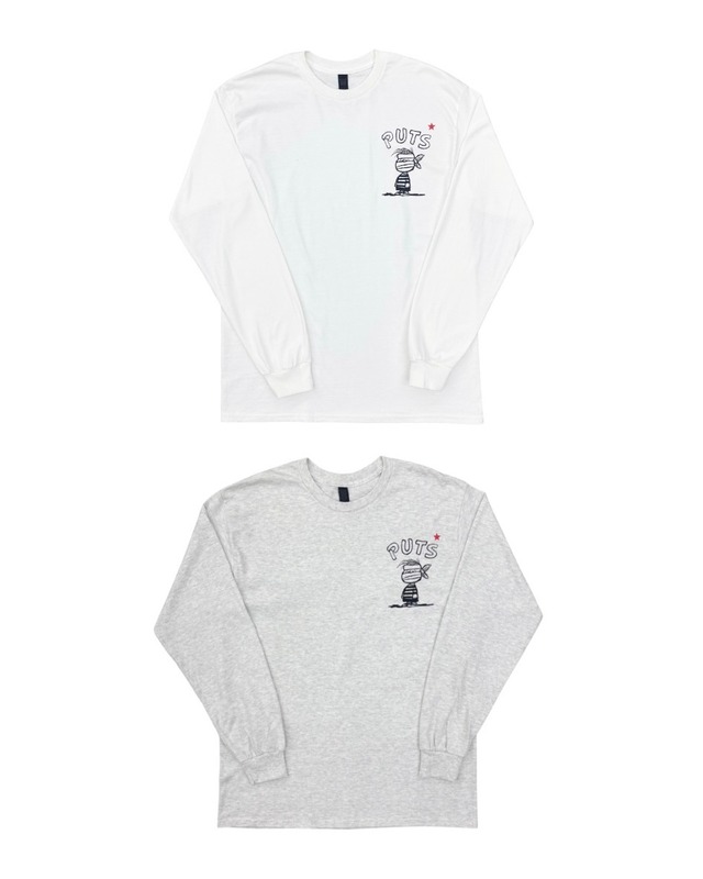 PUTS MASKED LINUS L/S TEE color: WHITE / ASH size: L / XL / 2XL price: ¥5,280- グラフィティアーティストPUTS氏ご本人が一枚ずつハンドシルクスクリーンでプリントしたTシャツ。 L 胸囲 114cm/背丈 73cm/肩幅 53cm/袖丈 66cm XL 胸囲 120cm/背丈 74cm/肩幅 58cm/袖丈 67cm