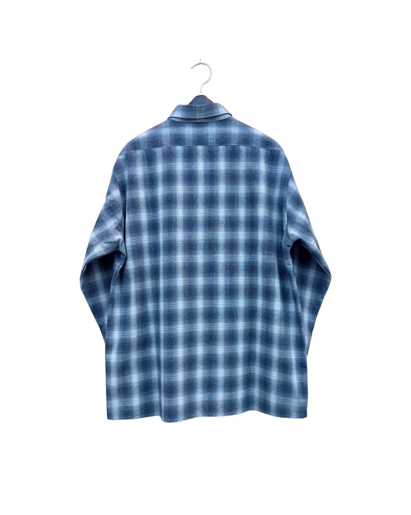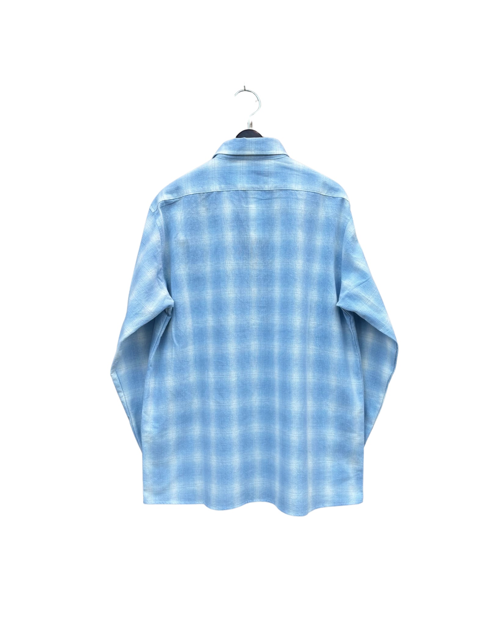 コットンの糸染めポプリン生地を使用して作製したオリジナルシャドウチェックシャツ。左胸ポケット上に刺繍でアートワークを配置。身頃とポケットの柄を合わせたインビジブルポケット仕様。コットン100%。