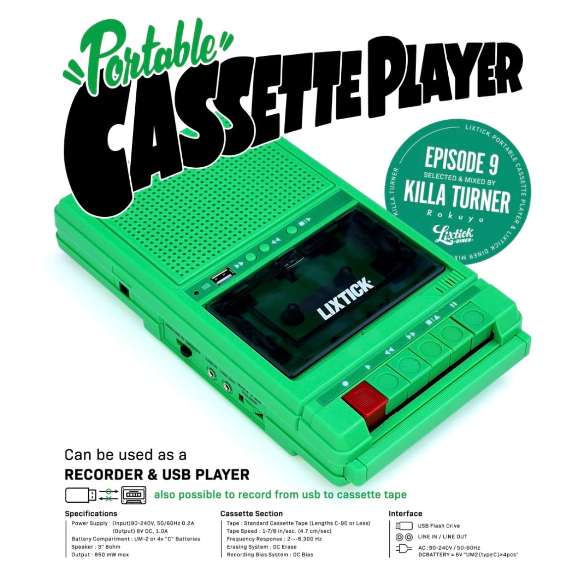 LIXTICK PORTABLE CASSETTE PLAYER (’25) PLAYER + LIXTICK DINER MIXTAPE “EPSIODE9” by KILLA TURNER(select)