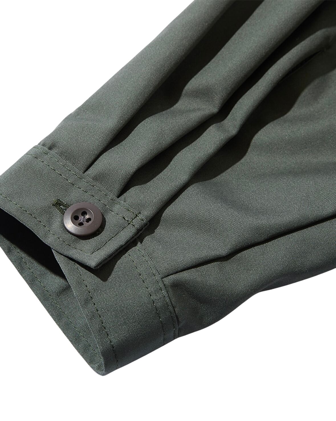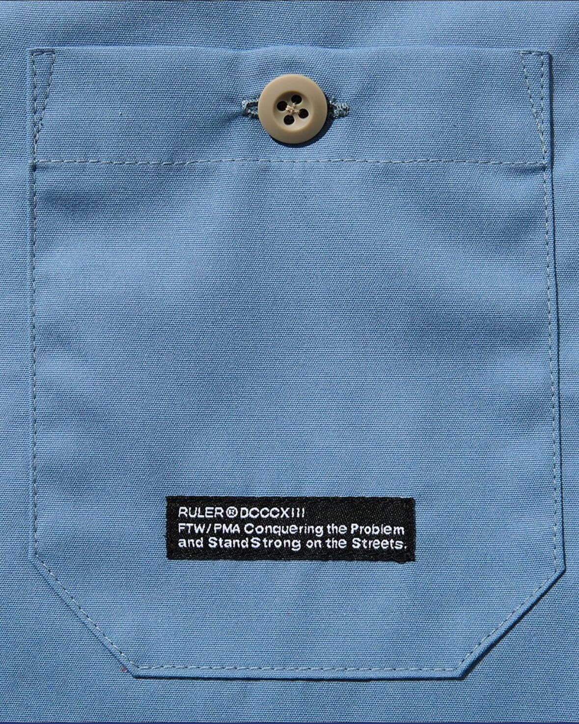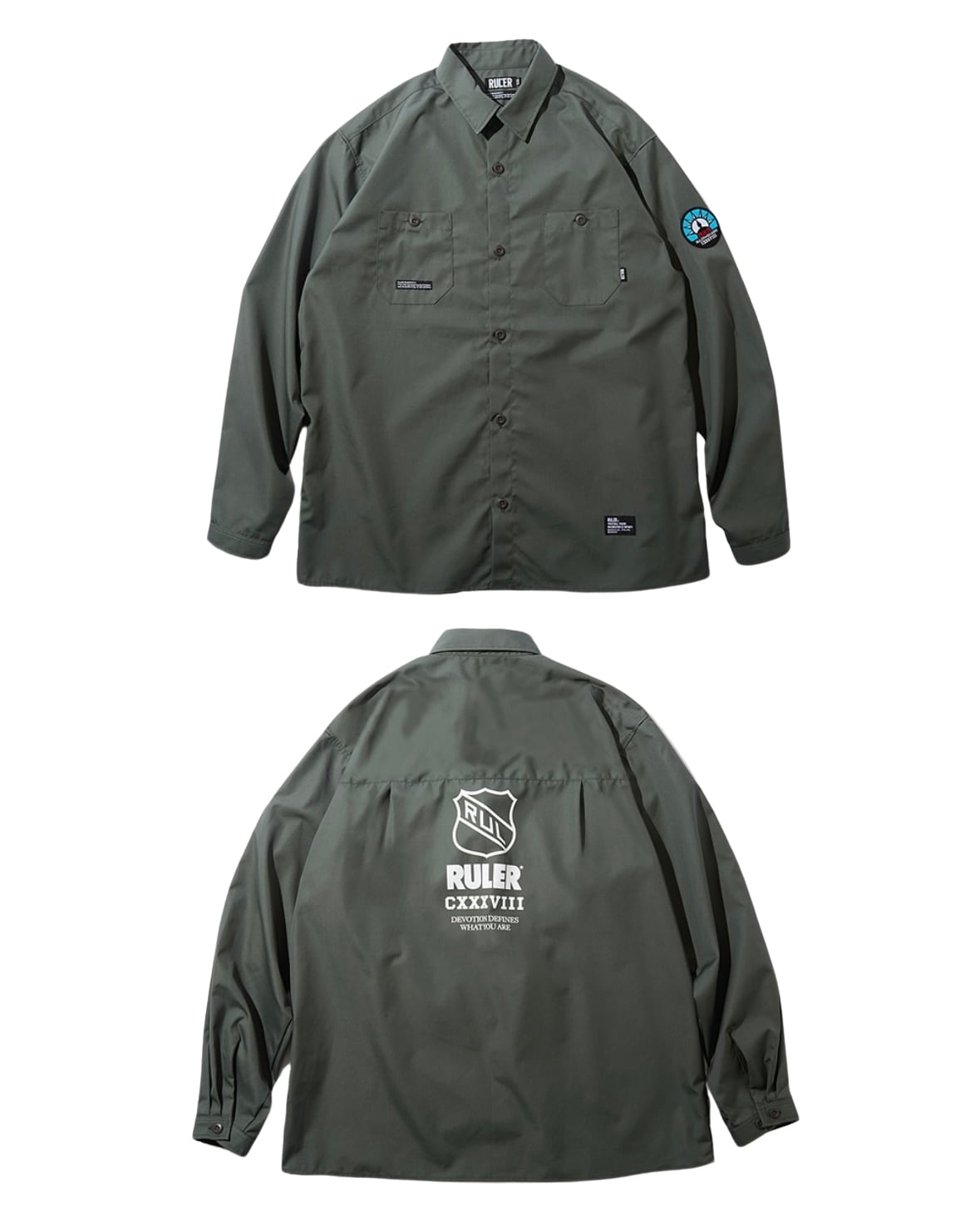 T/Cウェザー生地を使用し作製したワークシャツ。左裾にI.D.タグ, 右ポケット上にATTDタグ, 左袖にワッペン, バックにシルクスクリーンでアートワークを配置。