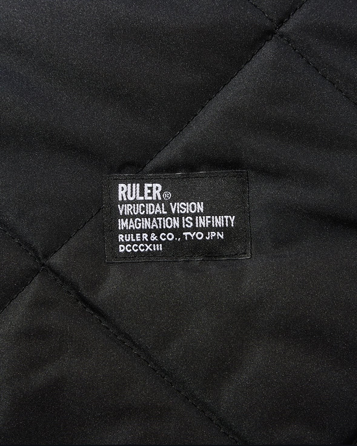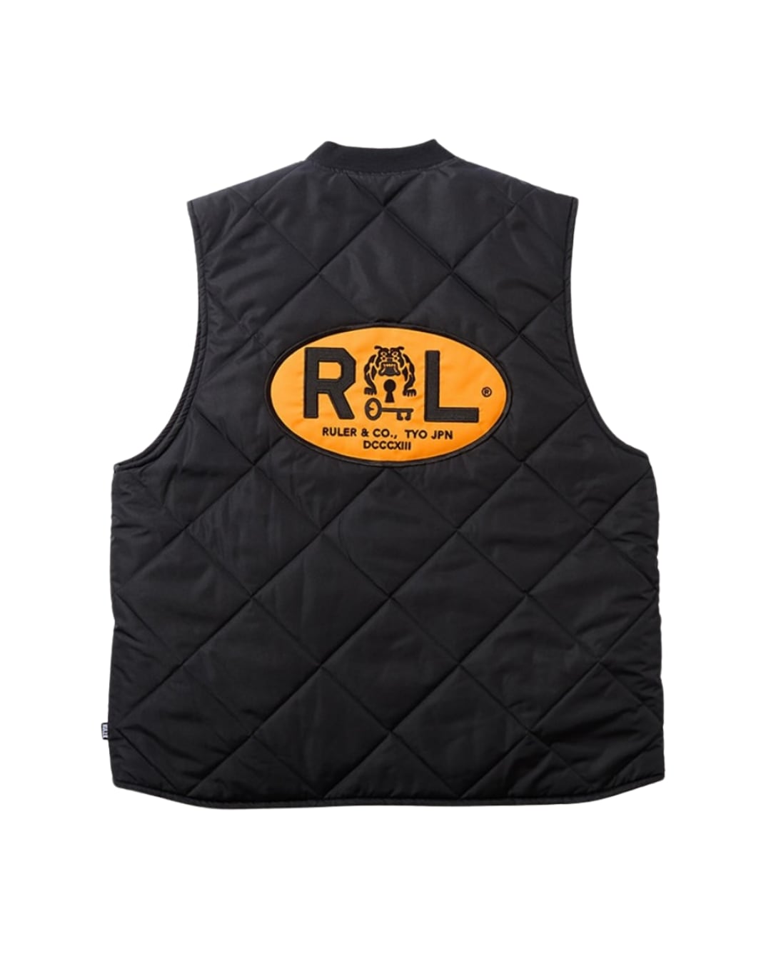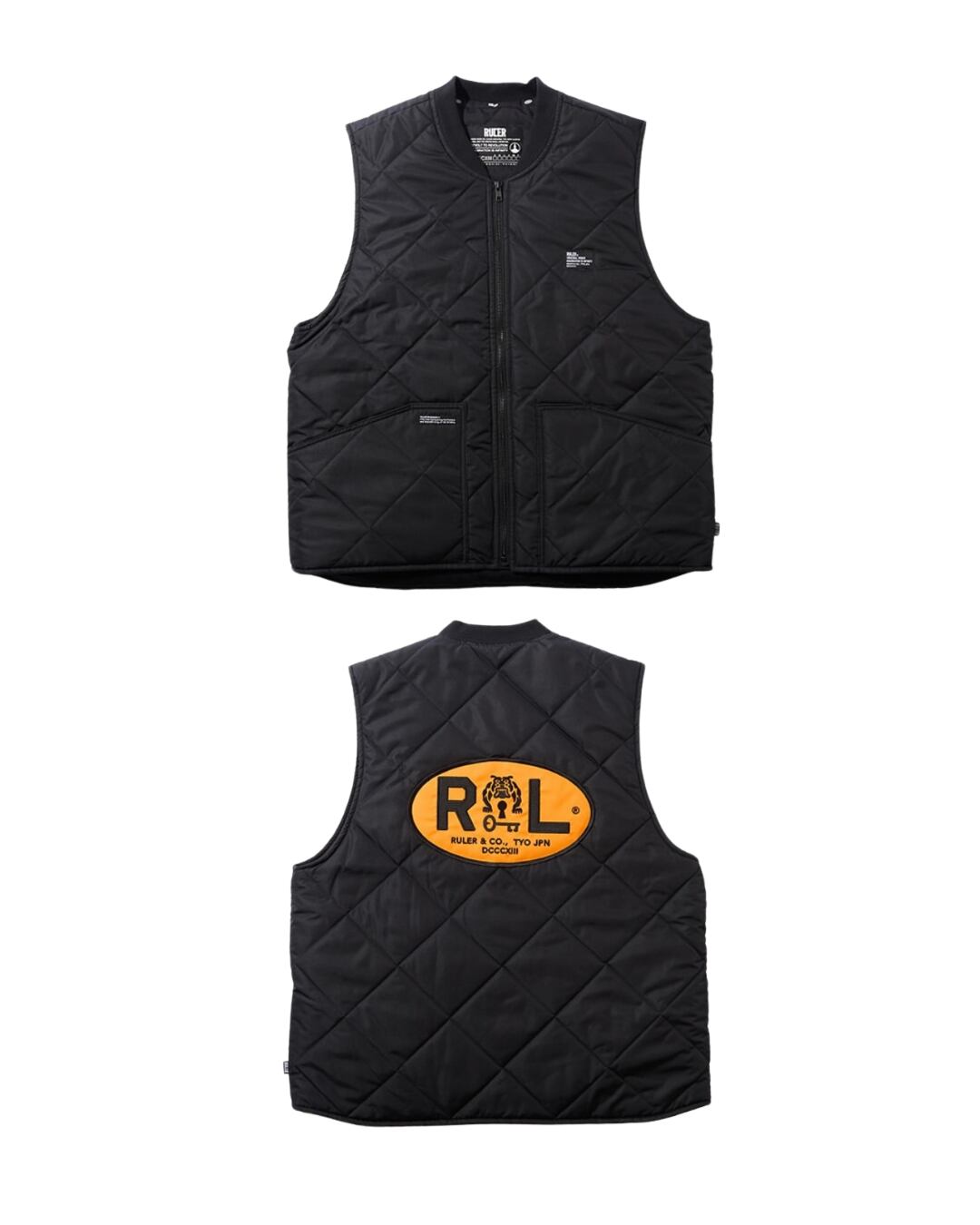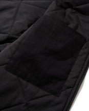 オリジナルダイアキルティングを使用し作製したキルティングベスト。フロントにI.D.タグとATTDタグ, バックにワッペンでアートワークを配置。インナーバックに缶ポケット有。