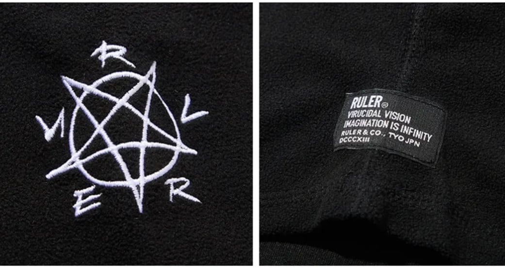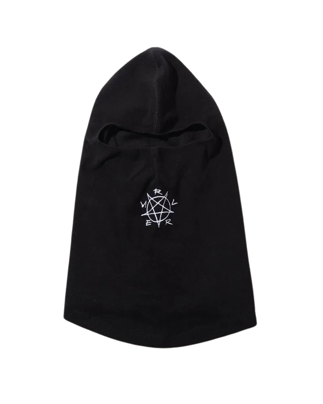 刺繍でアートワークを配した被り方次第で通常のビーニーとしても使用出来るマイクロフリースバラクラバ。バックにI.D.タグを配置。