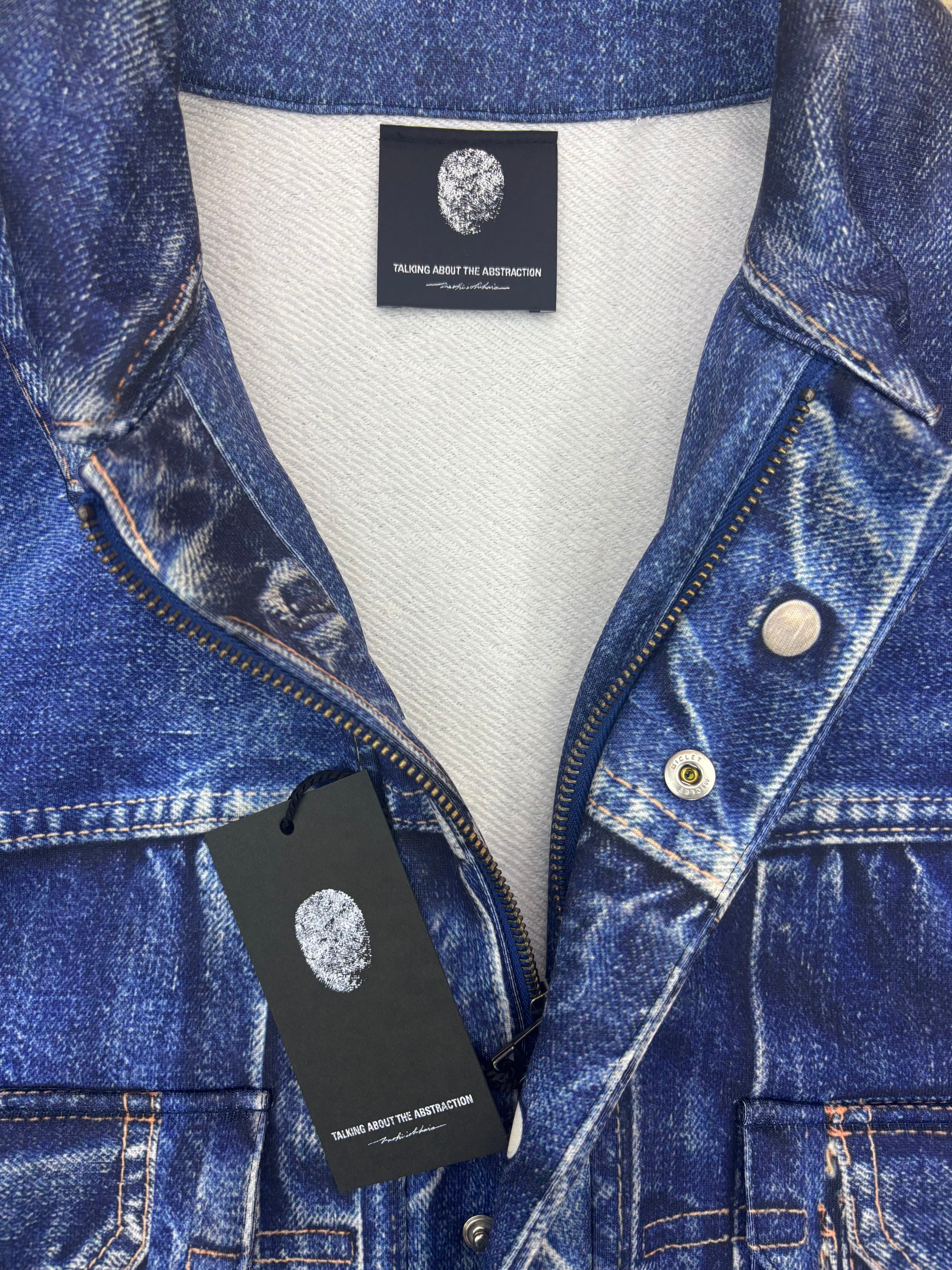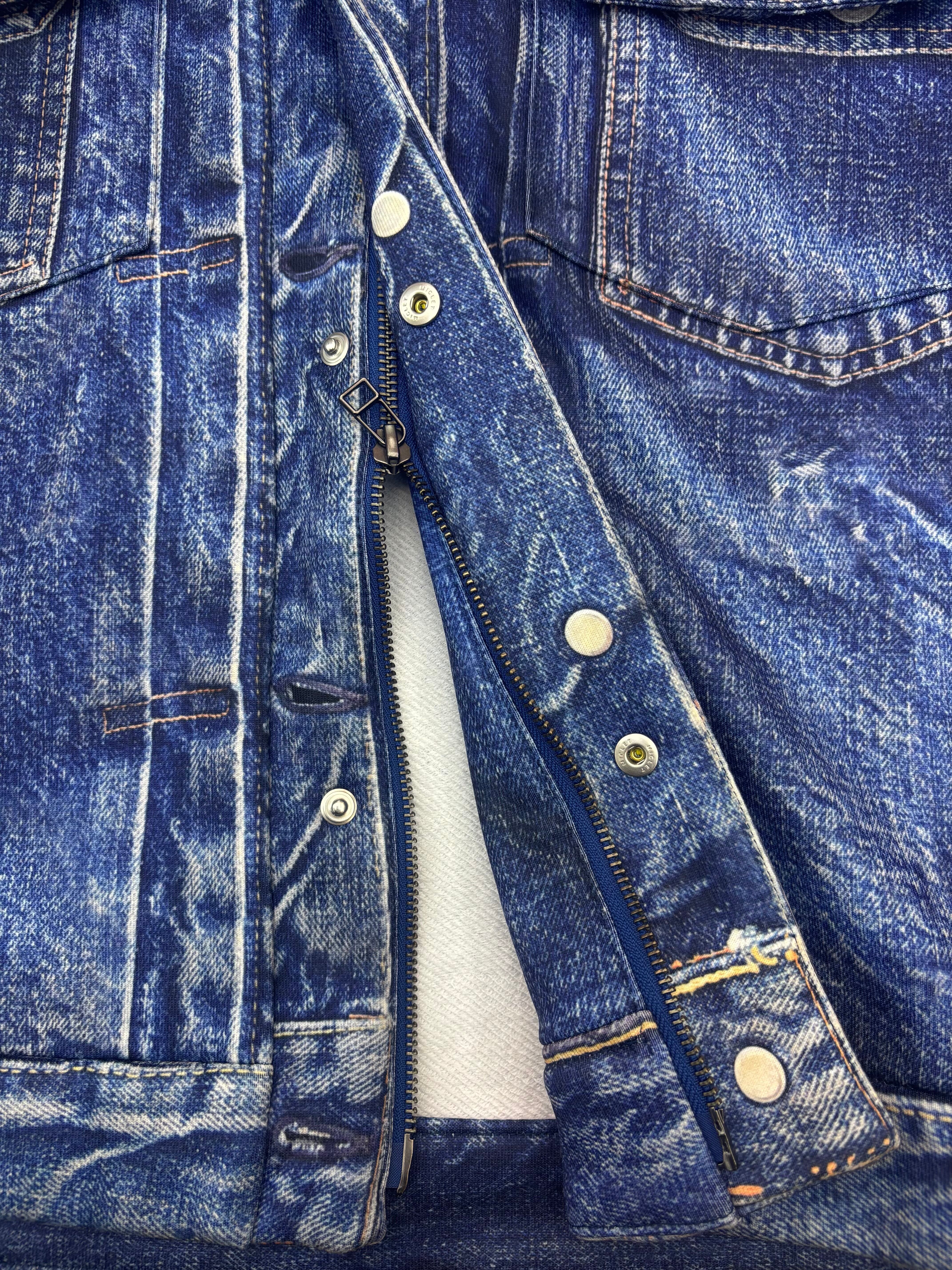 50年代のヴィンテージデニムを転写プリント。ジャケットタイプ。ダンボールニット素材。前面ファスナー、ドットボタン。