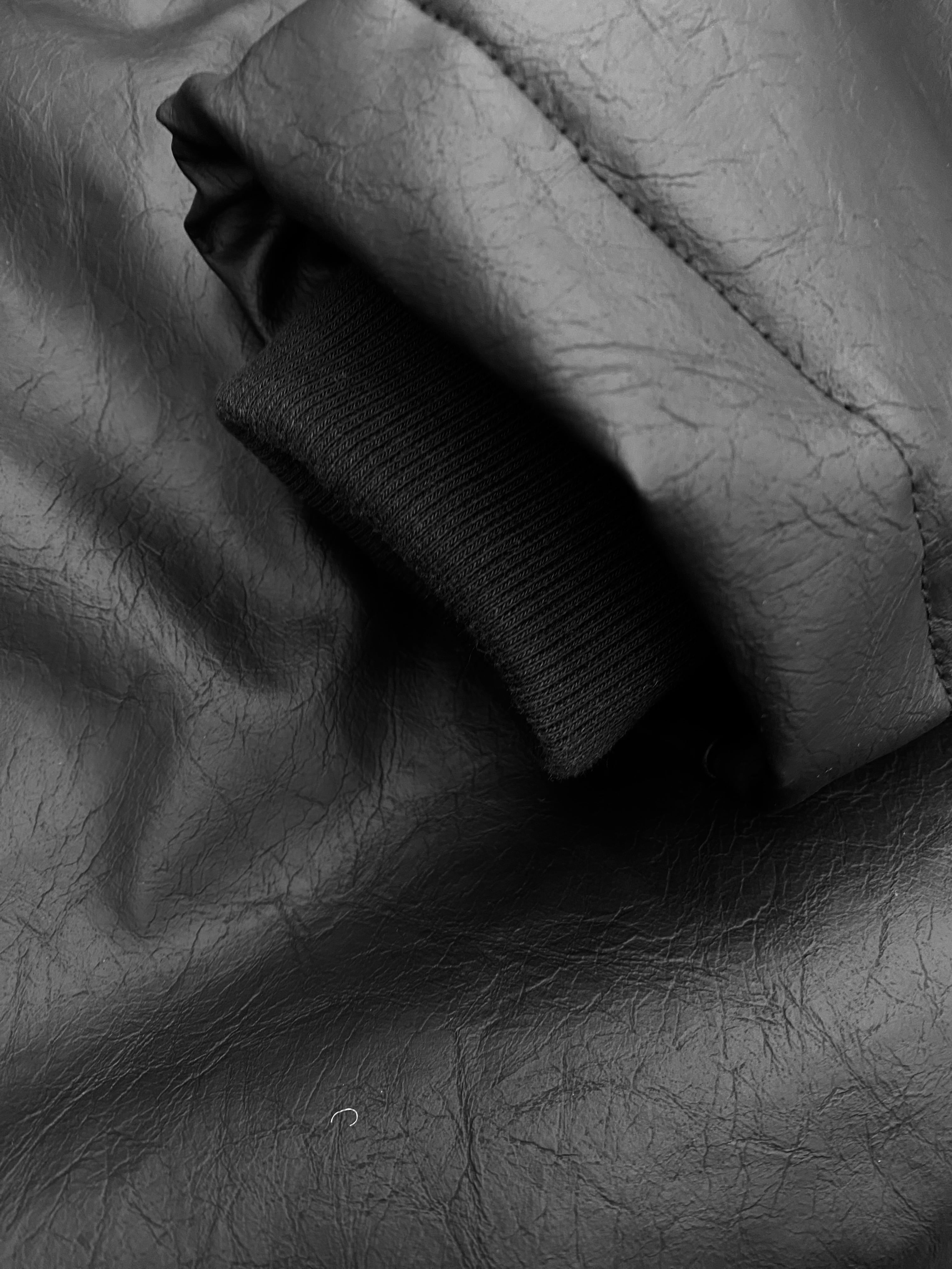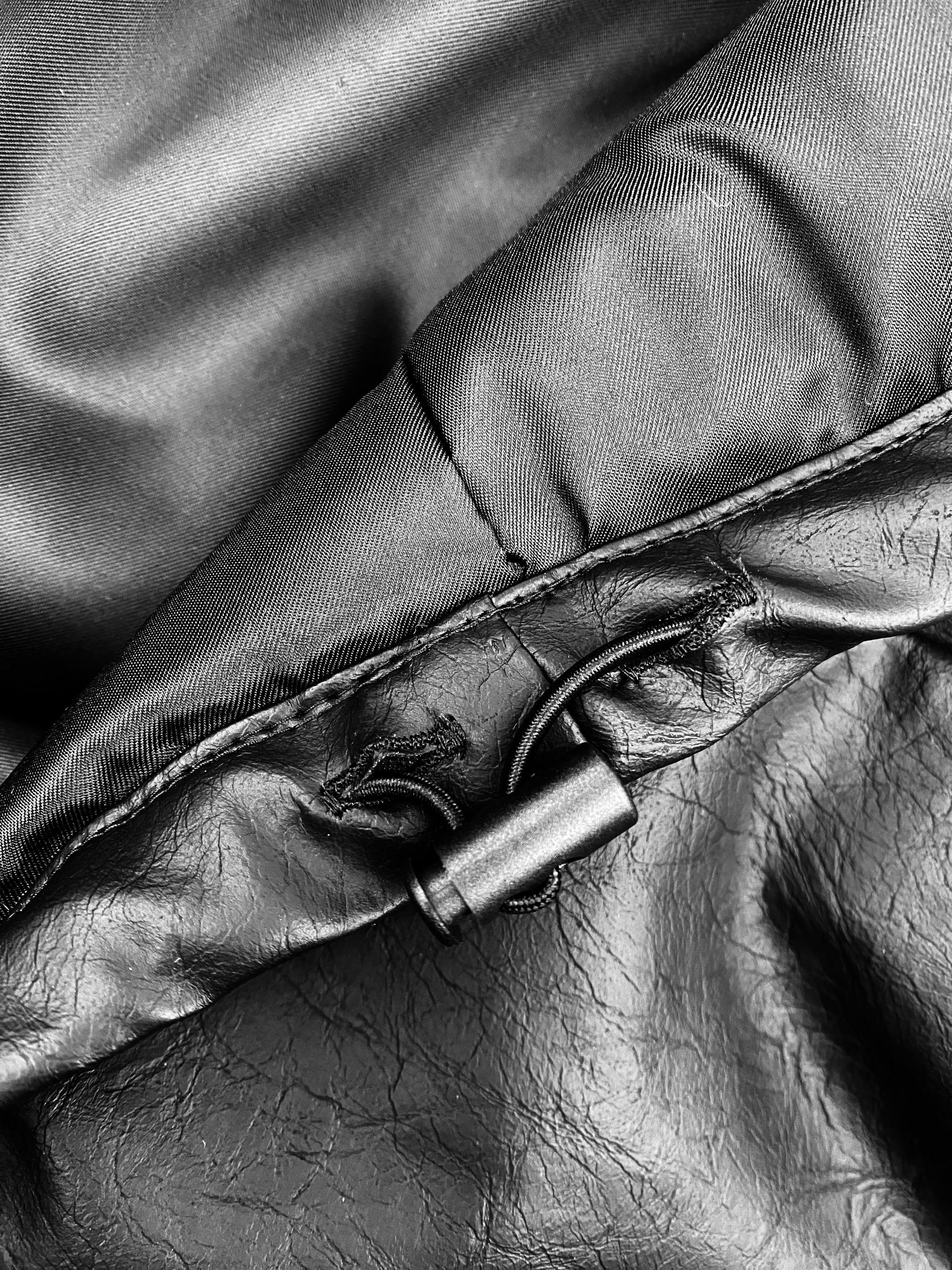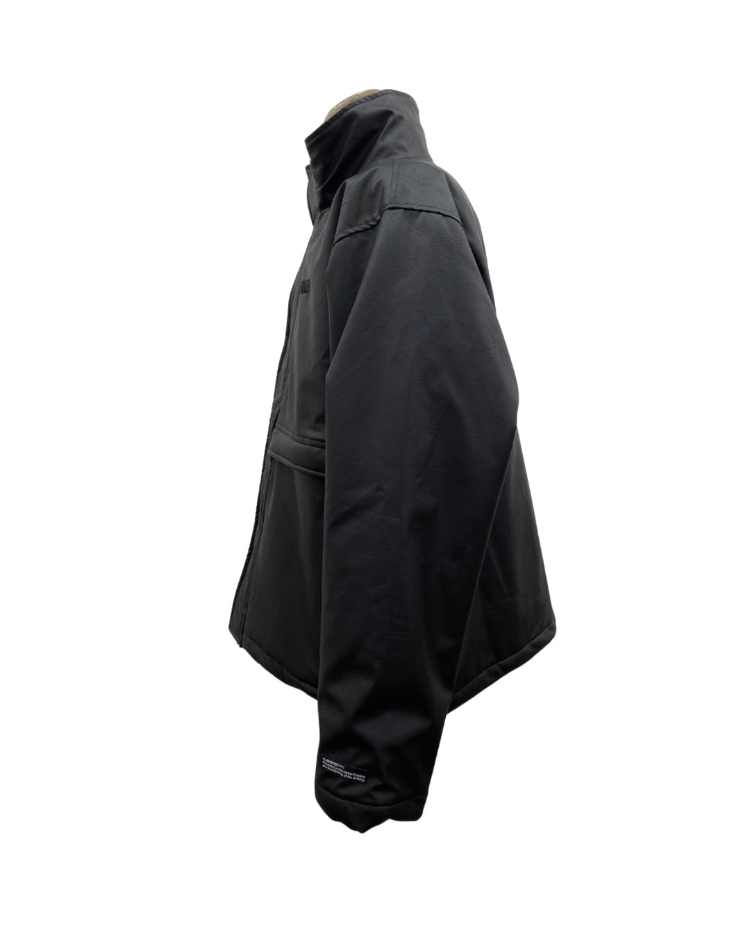 若干シボの入った合皮を使用し再構成されたスタンドカラーパデッドジャケット。