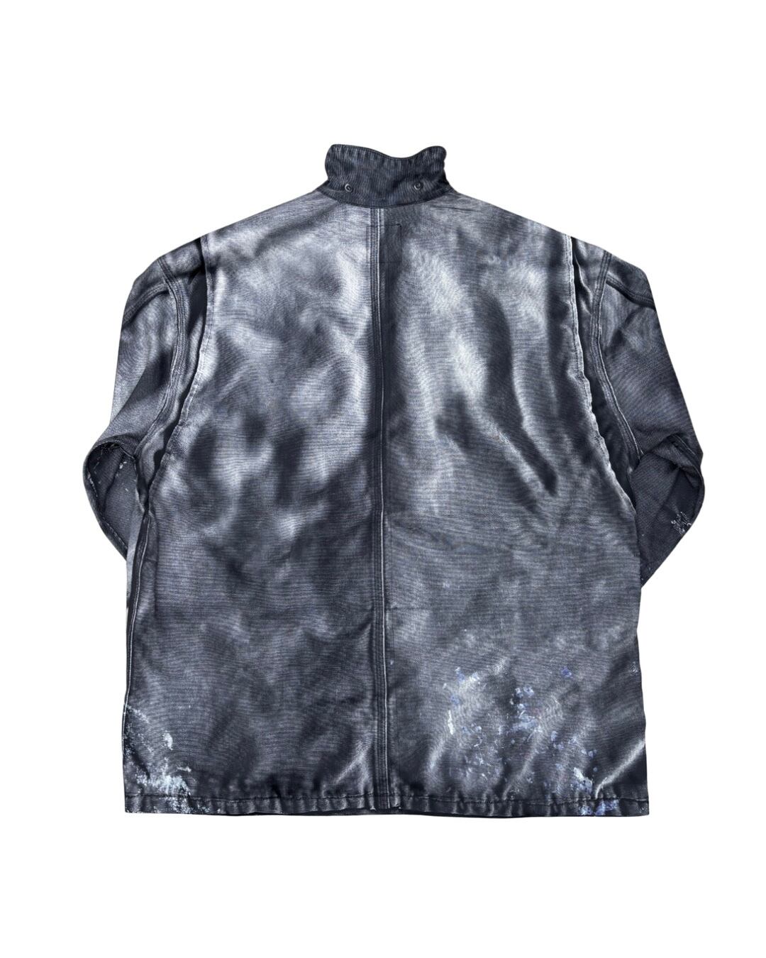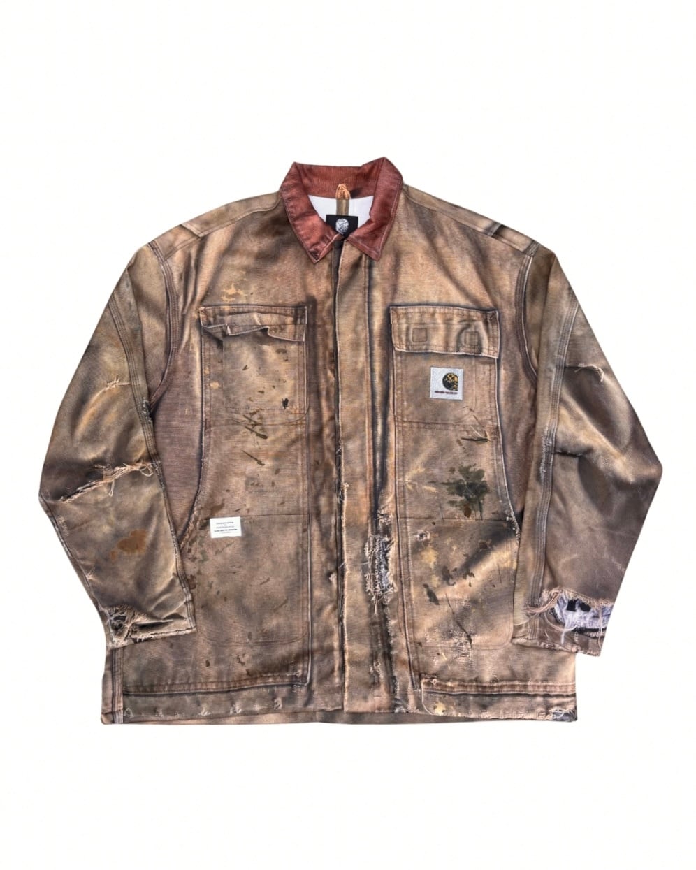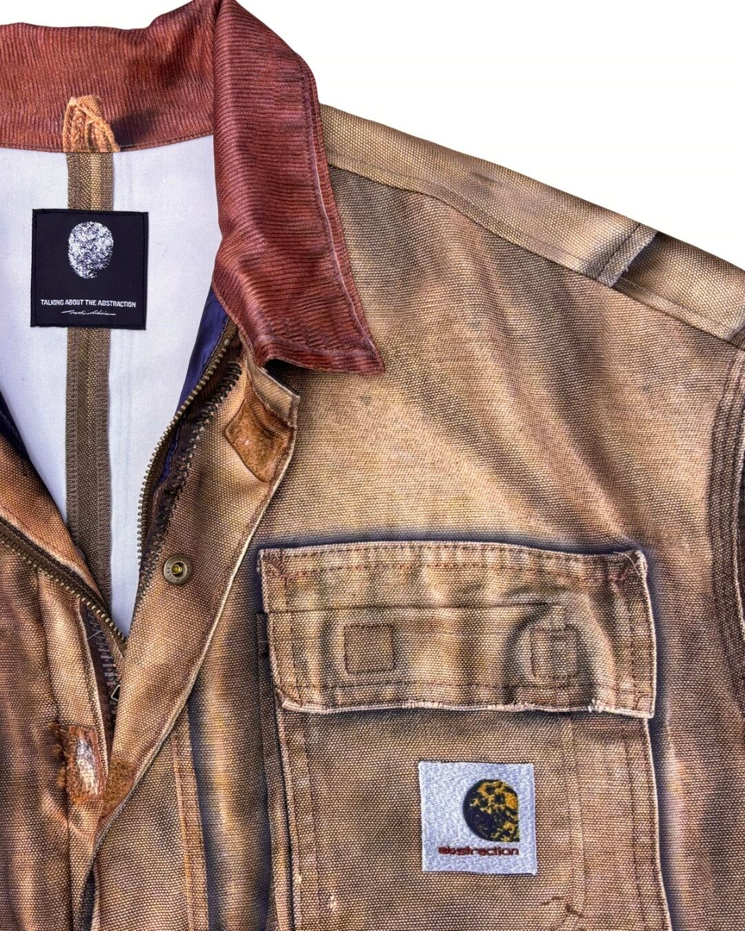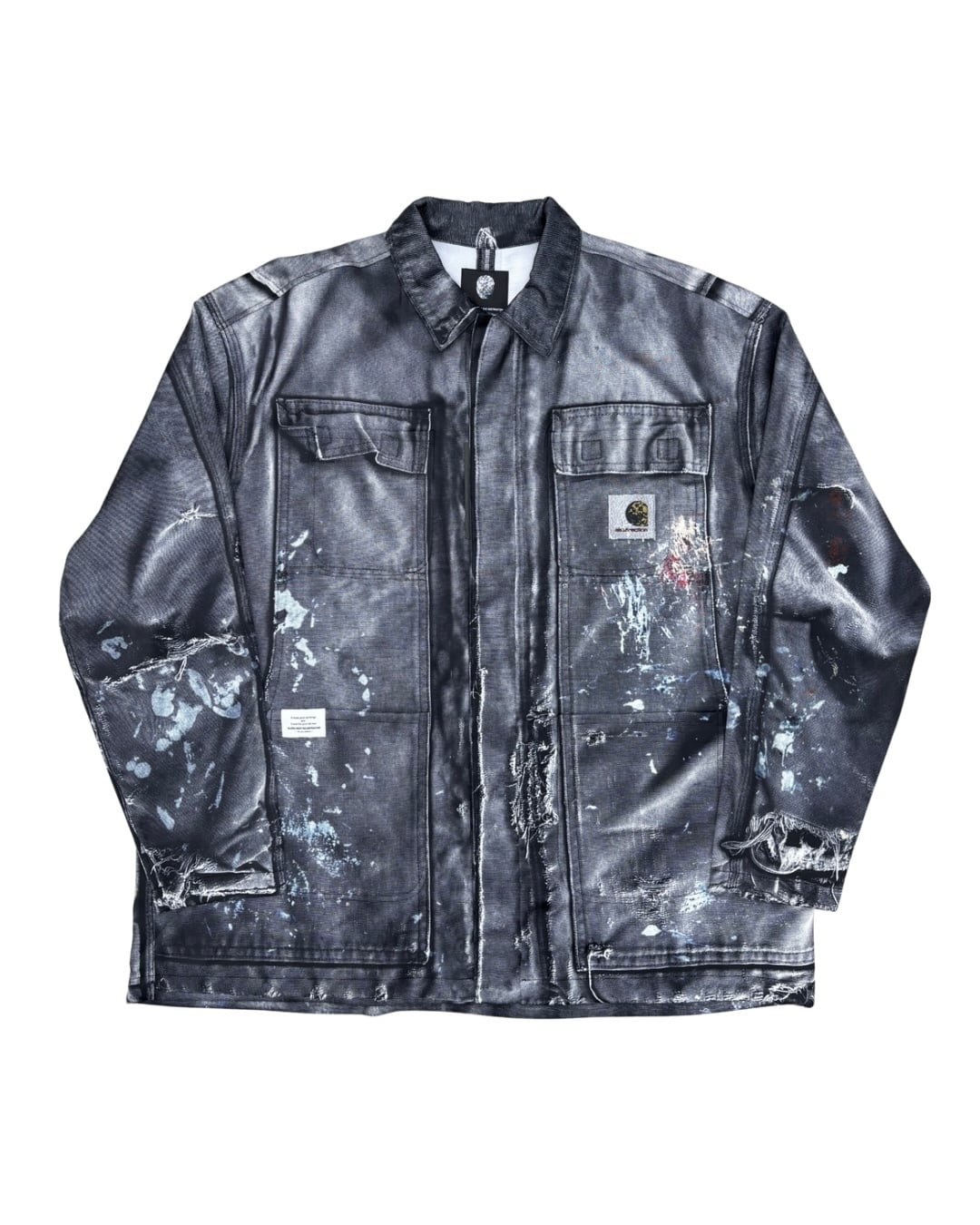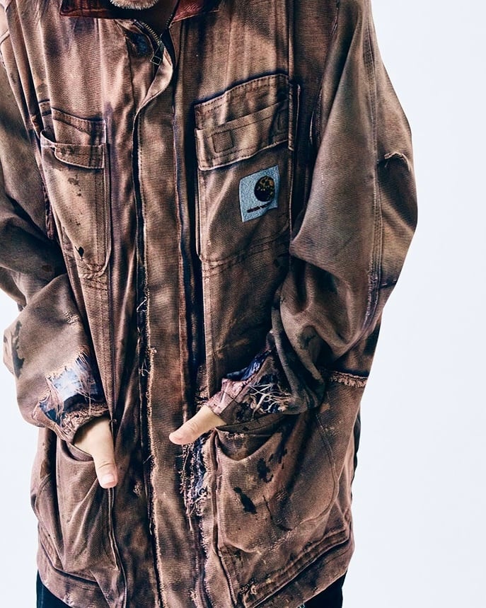 まるで長年着込まれたヴィンテージワークジャケットのようなリアルな経年変化やダメージ、ペイント跡まで転写で表現された一着。