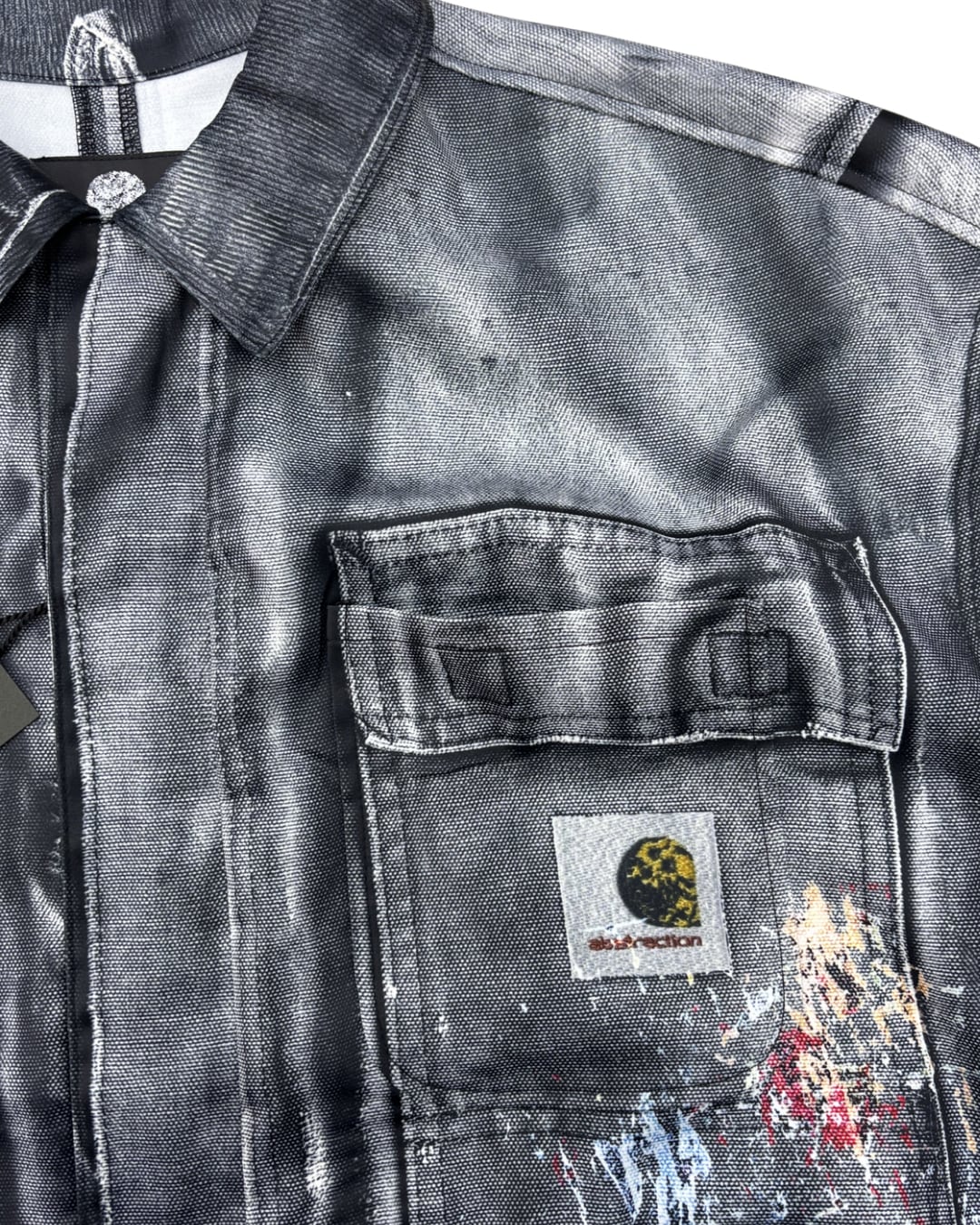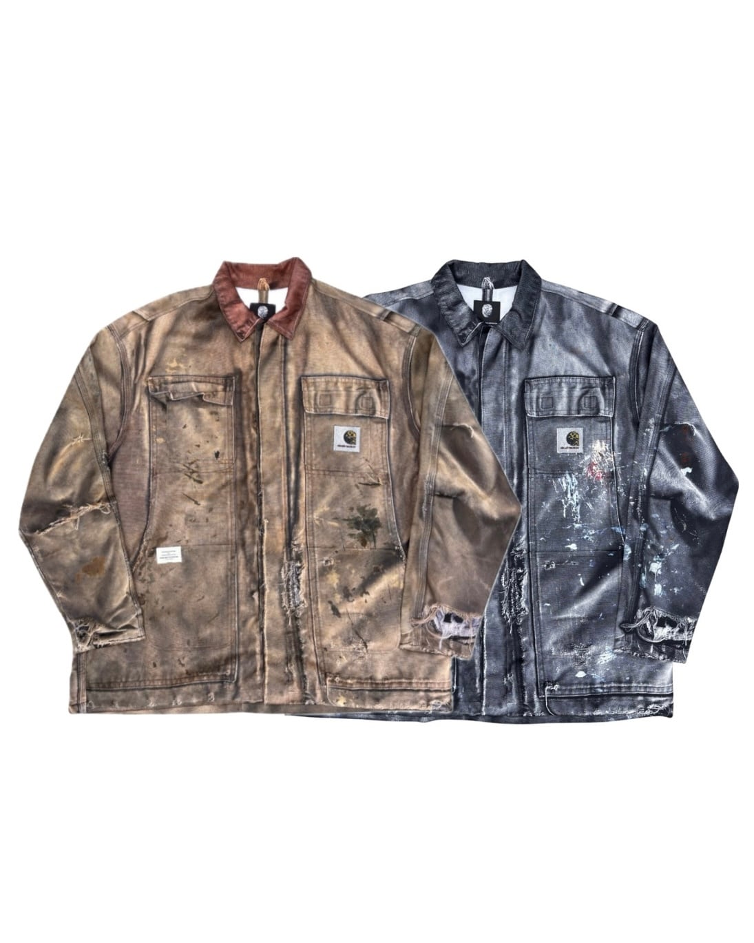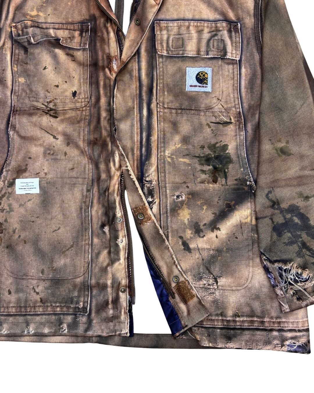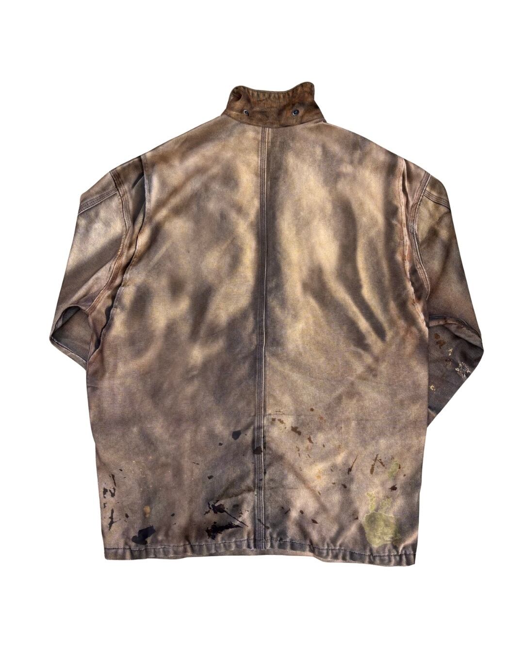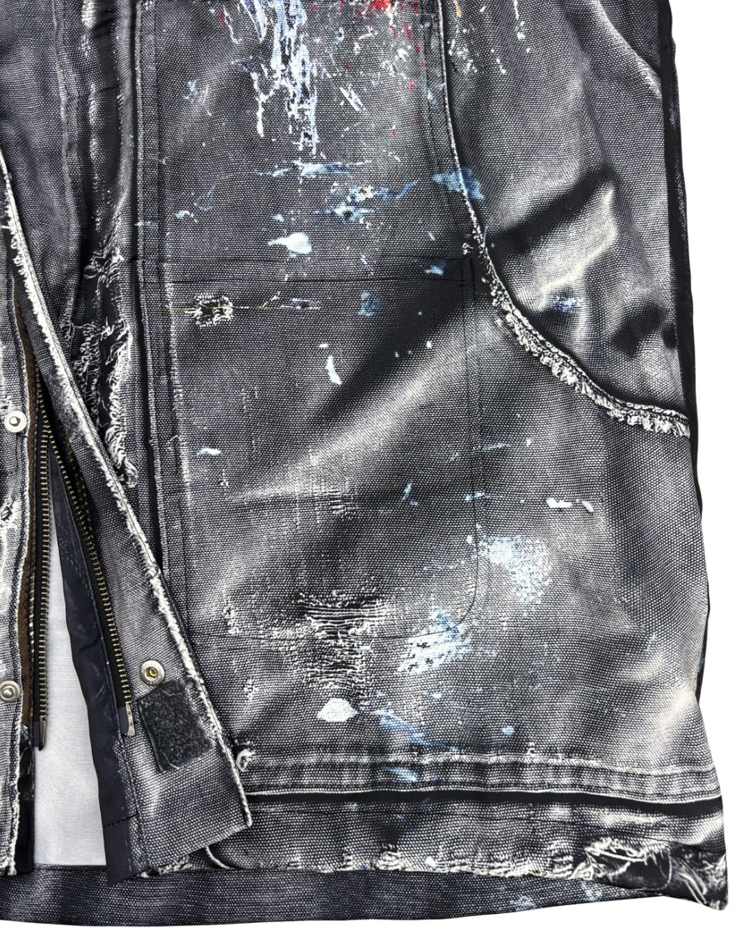 まるで長年着込まれたヴィンテージワークジャケットのようなリアルな経年変化やダメージ、ペイント跡まで転写で表現された一着。