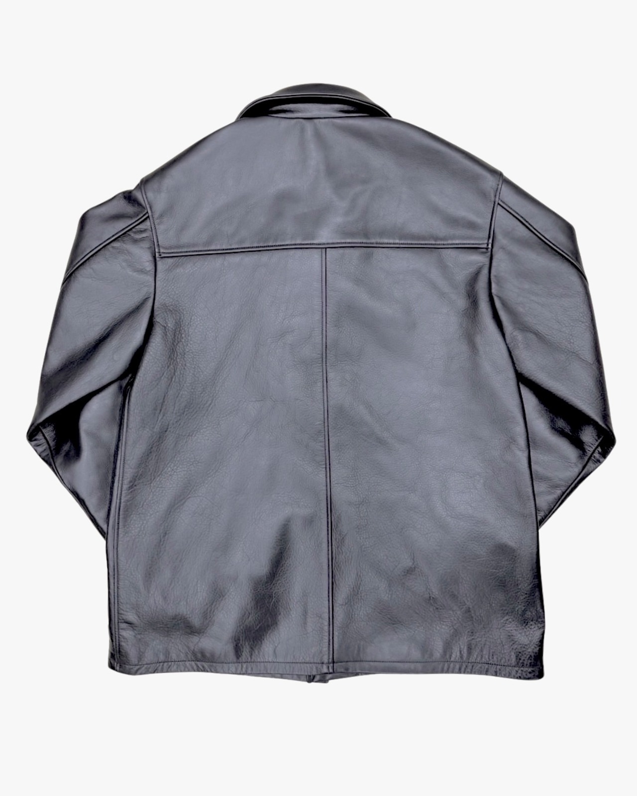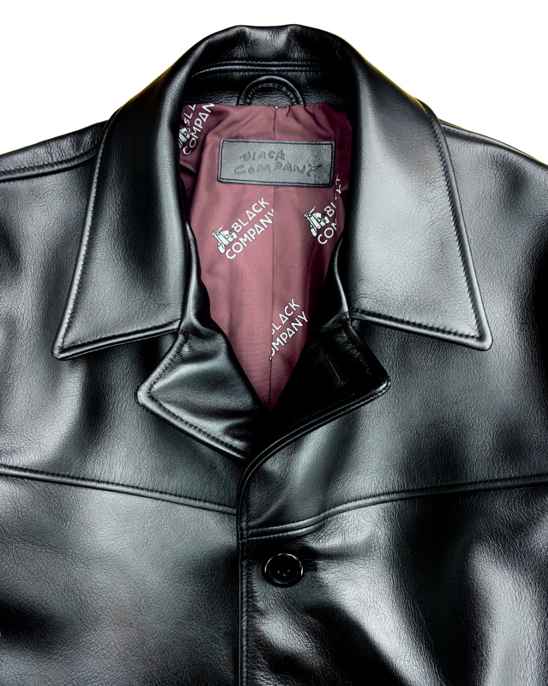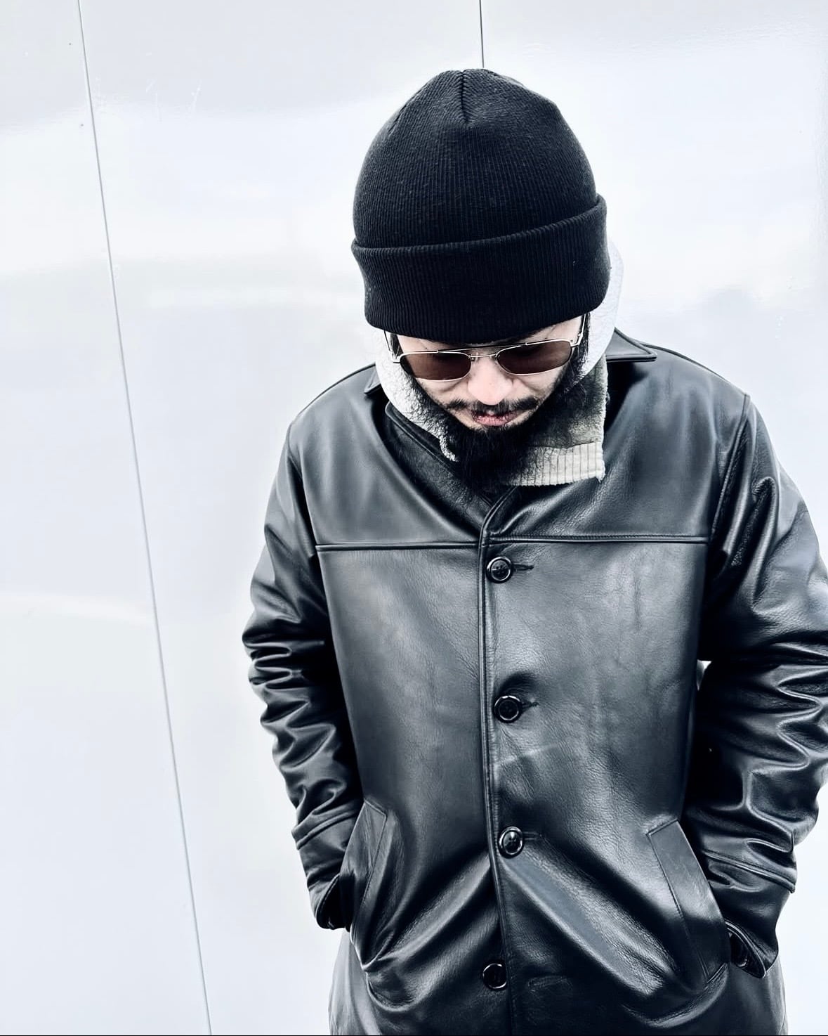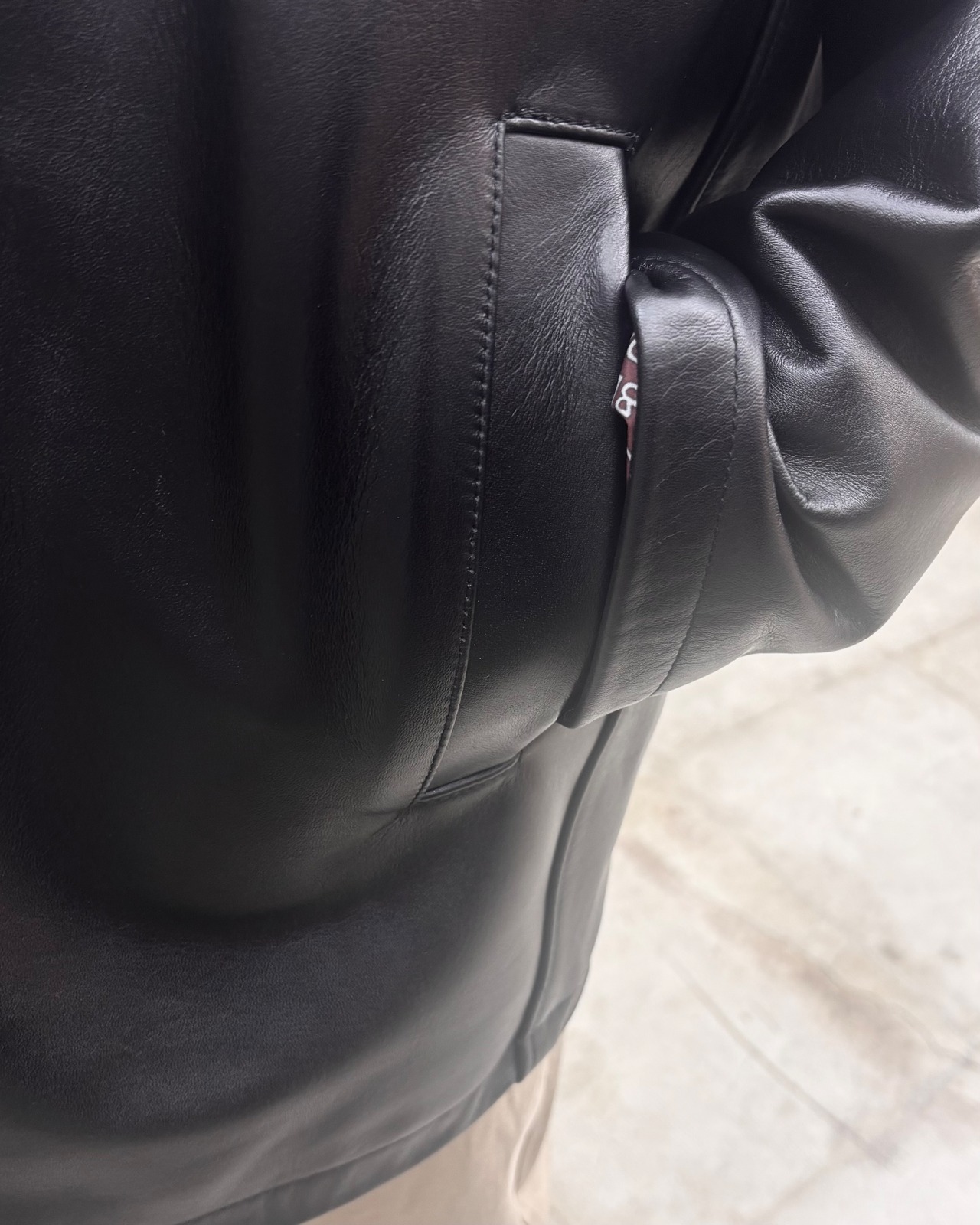 靱やかでほどよい厚みとほどよい光沢感のレザージャケット。太めのパンツ、フーディと合わせても違和感を感じさせないデザイン。